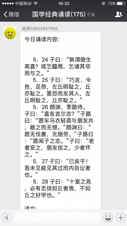 ????建立該微信群的是團市委工作人員劉曉靖。劉曉靖告訴周口晚報記者,建立該微信群的目的是想讓大家多讀讀國學經(jīng)典,增加大家的文學涵養(yǎng),讓大家養(yǎng)成讀書的習慣?!皠傞_始只有十幾個人,大家有些不好意思,有的人覺得自己讀得不好張不開口,我就做一些示范,引領大家誦讀。不久,加入微信群的人多了,通過幾個人帶動,大家誦讀的就多了?!眲跃刚f,讀的方式就是大家通過微信的語音功能,讀一些《論語》中的經(jīng)典句子。過了一段時間,大家對這種方式越來越認可,加入該微信群的人也越來越多,人數(shù)從剛開始的十幾個人增加到近200人?,F(xiàn)在,該微信群里不但有電臺、電視臺的專業(yè)主持人,而且有一些學者。以前拿不準的字,現(xiàn)在都會有人講解,大家也有了學習對象。這個微信群從成立到現(xiàn)在,《弟子規(guī)》、《大學》、《中庸》、《論語》已讀一遍,四書里面只剩下《孟子》還沒有讀。