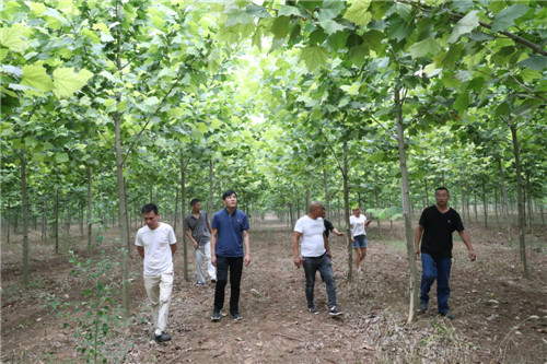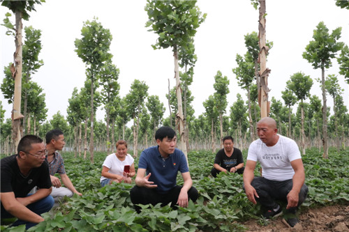 與前廟相鄰的大張村,是一個“天然大氧吧”。從大張村走出來的曹紅星在鄭州從事園林綠化多年,在朱口鎮(zhèn)黨委、鎮(zhèn)政府的支持和鼓勵下,他以1000元/畝的價格流轉了1000多畝土地,種植法桐、欒樹、國槐等綠化樹。有著豐富經(jīng)驗的曹紅星在種植綠化樹的同時,積極發(fā)展林下經(jīng)濟,在綠化樹下種植紅薯、大蒜等,有效提高了土地的利用率,經(jīng)濟效益顯著提高?!捌綍r,綠化林地除草、抗旱、施肥需要用工,收種紅薯、大蒜等也需要用工,用工時貧困戶優(yōu)先。只要有勞動能力,來這里就能掙錢?!辈芗t星說,林業(yè)經(jīng)濟的快速發(fā)展為鄉(xiāng)親們脫貧致富提供了保障。