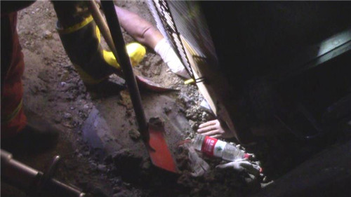 指揮員在與司機(jī)溝通時(shí)發(fā)現(xiàn),由于車身很重,司機(jī)手臂很快出現(xiàn)血液流通不暢、知覺(jué)微弱現(xiàn)象,如不及時(shí)脫困,后果十分嚴(yán)重。情況緊急,救援人員先利用剪擴(kuò)器對(duì)駕駛室與被困人員手臂處進(jìn)行擴(kuò)張,但由于車身較重,地面所墊硬物無(wú)法承受壓力,擴(kuò)張器無(wú)法發(fā)揮作用。隨后,救援人員利用鐵鍬在被困人員手臂下進(jìn)行挖土,5分鐘后,隨著空間的逐漸擴(kuò)大,被困人員手臂被小心翼翼抽回,司機(jī)成功脫困,消防指戰(zhàn)員從駕駛證另一側(cè)把他救出。