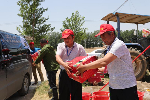 6月4日中午,太康縣委宣傳部常務(wù)副部長(zhǎng)趙勇與瀘州老窖(懷舊)公司豫南區(qū)負(fù)責(zé)人劉光軒等工作人員一起,在王集鄉(xiāng)慰問(wèn)后又不顧炎熱來(lái)到了馬廠鎮(zhèn)麥?zhǔn)找痪€,給工作人員送去礦泉水、粽子、牛奶等用品。