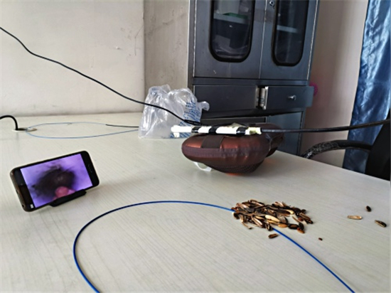 記者看到徐醫(yī)生自制的呼吸內(nèi)鏡,胸部是用一個(gè)家用電動按摩枕代替的,用來能模擬人的胸部呼吸起伏;按摩枕上固定了兩個(gè)用打印紙卷成的小紙筒,用來代替氣管;屏幕是用手機(jī)代替的,用WIFI和氣管鏡鏈接,影像可以通過手機(jī)屏幕看到;內(nèi)鏡手柄是徐醫(yī)生用膠泥結(jié)合真實(shí)設(shè)備形狀、重量捏制而成的。當(dāng)著記者的面,徐醫(yī)生把一小半瓜子皮放入模擬人體氣管的紙筒,在手機(jī)屏幕的導(dǎo)航下通過氣管鏡到達(dá)異物所在位置,熟練地用異物鉗夾出異物。