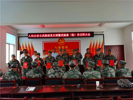 本次大會(huì)確定在人和辦武裝部建立1個(gè)黨支部,人和辦武裝部長(zhǎng)王超任黨支部書(shū)記,在轄區(qū)9個(gè)社區(qū),每個(gè)社區(qū)建立1個(gè)3人黨小組,黨小組成員包括在該社區(qū)設(shè)置的1名兼職武裝委員和在該社區(qū)基本單元網(wǎng)格設(shè)置的2名兼職武裝組員。每個(gè)黨小組編入人和街道武裝部黨支部,并報(bào)區(qū)人武部備案,制定任命證書(shū)。