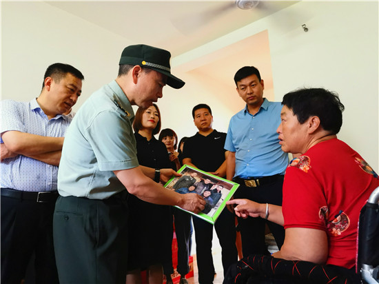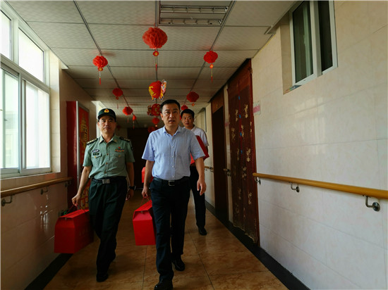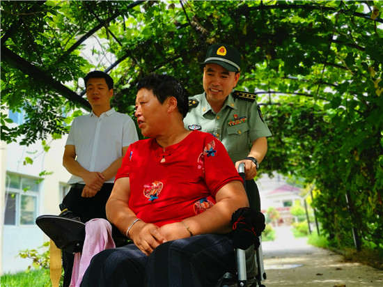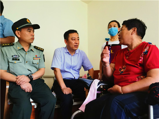 走進(jìn)位于太昊路上的周口市老年護(hù)理院,院內(nèi)整潔有序、花蕊吐香鳥鳴聲聲,小徑通幽處的涼亭內(nèi)三五老人打牌、聊天,一副愜意安詳?shù)纳顖鼍啊T诤顕I(lǐng)母親王玉勤居住的房間內(nèi),李揚(yáng)、孫光濤等人坐在床邊與她聊天談心,看到這么多人來慰問她,王玉勤眼中流下了感動的眼淚,她對慰問人員表示感謝,說自己來護(hù)理院近一年來,吃住條件都不錯,護(hù)理院照顧的無微不至,身體一天天恢復(fù),閑暇時還能不依賴輪椅自己走上一段路。她激動地說:“感謝黨和政府的親切關(guān)懷,我最大的愿望是希望倆兒子永遠(yuǎn)聽黨的話,在部隊(duì)安心服役、再立新功,用優(yōu)異的成績回報(bào)黨和政府對我們?nèi)业年P(guān)愛?!?/p>