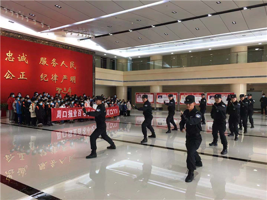 1月10日是首個(gè)“中國人民警察節(jié)”和“110”誕生35周年。小記者應(yīng)邀提前走進(jìn)市公安局參觀體驗(yàn)。9日上午,在二樓大廳,特警隊(duì)員進(jìn)行了擒敵拳表演,現(xiàn)場掌聲經(jīng)久不息。