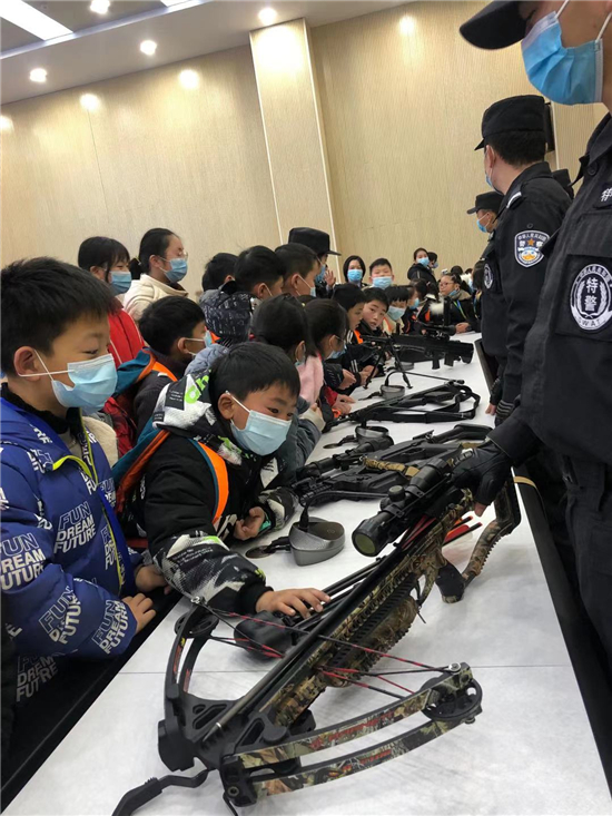 在指揮中心大廳,小記者們還有序參觀了現(xiàn)場展示的特殊警用裝備。除了手槍外,還有沖鋒槍、狙擊步槍、激光炫目槍和強(qiáng)力弓弩等。市公安局特警支隊(duì)民警向小記者們介紹了各種槍支及裝備的性能和使用方式,并邀請小記者觸摸一把警用槍械。