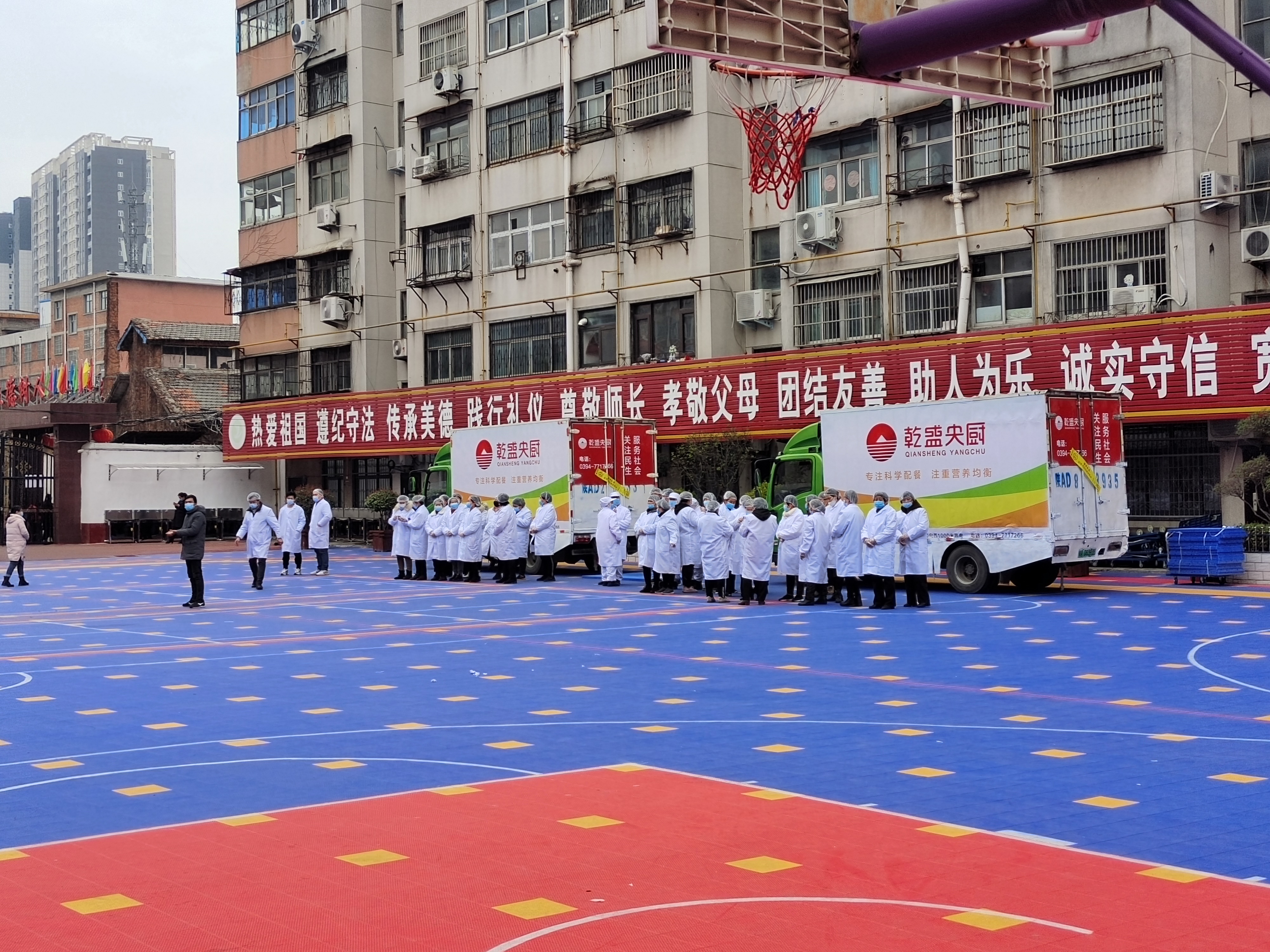 11時許,13000余份熱騰騰的飯菜即將送到周口市中心城區(qū)中小學生手中,直播團隊對七一路二小的配送情況進行現場直播。兩輛運餐大卡車,20余名工作人員整裝待發(fā),乾盛央廚鄭州總公司的營銷部負責人現場指揮調度七一路二小的發(fā)餐工作。揭掉卡車上的封條,留樣,測溫,裝車,按班分送,分發(fā)不銹鋼餐具,“哇!獅子頭?。 痹诤⒆觽兊捏@呼聲中,兩葷一素,一份米一份湯,熱氣騰騰地盛到孩子手中的餐具中。“孩子們吃不吃的飽呀?”面對各直播平臺上網友的提問,乾盛央廚鄭州總公司營銷部負責人回答:“我們提前有準備,飯、菜我們都免費加,保證孩子們都吃飽,請家長朋友們放心?!?/p>