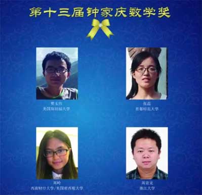 中國數(shù)學(xué)會21日揭曉了第十三屆華羅庚數(shù)學(xué)獎、第十六屆陳省身數(shù)學(xué)獎和第十三屆鐘家慶數(shù)學(xué)獎的獲獎名單。今年獲得鐘家慶數(shù)學(xué)獎的分別是美國斯坦福大學(xué)的樊玉偉(來自河南周口)、首都師范大學(xué)的張蕊、西南財經(jīng)大學(xué)和美國密西根大學(xué)的周嶺、浙江大學(xué)的周青龍等4名博士生。……[詳細]