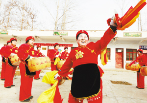 ?、芊鰷峡h江村鎮(zhèn)江南盤鼓隊正在村室緊張排演節(jié)目。春節(jié)期間,她們走上街頭,為當(dāng)?shù)厝罕娝蜕衔幕蟛汀?nbsp; (記者 王 映 攝)