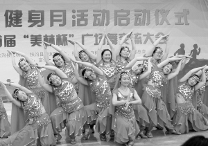 5月10日上午,扶溝縣一女子代表隊在臺上表演舞蹈。當日,扶溝縣2015年健身月啟動儀式暨廣場舞交流大會拉開帷幕。來自全縣各鄉(xiāng)鎮(zhèn)巾幗代表隊依次走上舞臺,展現(xiàn)其優(yōu)美的舞姿。在接下來的一個月里,該縣還將聯(lián)合各類體育協(xié)會在城區(qū)開展武術(shù)、跆拳道等體育活動。盧付昌 申蘭霞 攝
