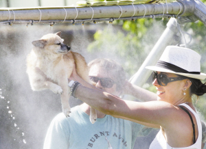 熱浪襲擊溫哥華 6月27日, 在加拿大溫哥華, 一名女子利用街頭的噴水設施為寵物狗降溫。據(jù)加拿大環(huán)境部門檢測,不列顛哥倫比亞省沿岸地區(qū)當日最高氣溫達攝氏三十度,內(nèi)陸地區(qū)升至四十度。溫哥華市政府已發(fā)出高溫預警,呼吁民眾外出時注意身體狀況,謹防中暑。新華社發(fā)